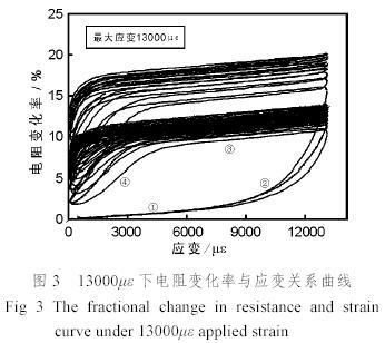 图3为试件应变控制在13000µε之内时的电阻变化率与应变的关系曲线。从图中可以看出,在较高应变水平下,试件的电阻变化率和应变关系曲线同低应变水平相比差别很大,在荷载作用的初期,电阻变化率随应变的变化很小,在约8000~10000处尚不足5%;而在加载后期,电阻变化率随荷载的增加急剧增大,最大应变处的电阻变化率大约在10%~20%之间。首次卸载的曲线形状与首次加载也完全不同,具体表现为高应力水平时,电阻变化率随应变变化较小,而低应力水平时,电阻变化率随应变变化较大。在接下来的荷载循环中,加载和卸载的曲线形状均相似,但也与首次加载不同。