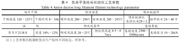 负离子涤纶长丝的生产工艺和短纤维相类似,先需要负离子粉,少量的添加剂来制备可以用来直接加工成负离子纤维的负离子切片。只不过在生产过程中需要特别注意负离子切片的干燥温度。它的一般生产过程也和生产涤纶纤维具有很大的相似之处,但在生产负离子涤纶短纤维时由于生产设备的差别,其生产工艺条件也具有一定的不同之处,一般需要控制的纺丝POY工艺条件如表4。