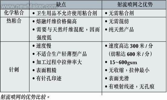 与热粘合和化学粘合无纺布相比,射流喷网无纺布所占的市场份额仍较少,它除具有成本优势外,还具有其他决定性的优势。