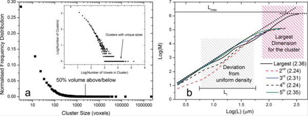 图2: 集群统计:(a)铬酸锶群的频度分布;(b) 五个最大铬酸锶群质量与尺度的分布(分形维数)。