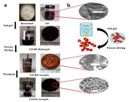 针对目前由于水分移除产生的毛细管作用力会引起孔收缩甚至坍塌,导致碳气凝胶的比表面积较低的问题,研究人员将氧化石墨烯添加到酚醛树脂中,利用氧化石墨烯作为模板剂和增强剂的特性来调控碳气凝胶的孔结构,经一步碳化法获得了超高比表面积(2728 m2?g-1)的碳气凝胶。所得的碳气凝胶有望用作超级电容器电极材料以及Li电池和Na电池的负极材料。相关工作以快讯(Communication)形式发表在Microporous and Mesoporous Materials, 2016 , 240 :145-148。