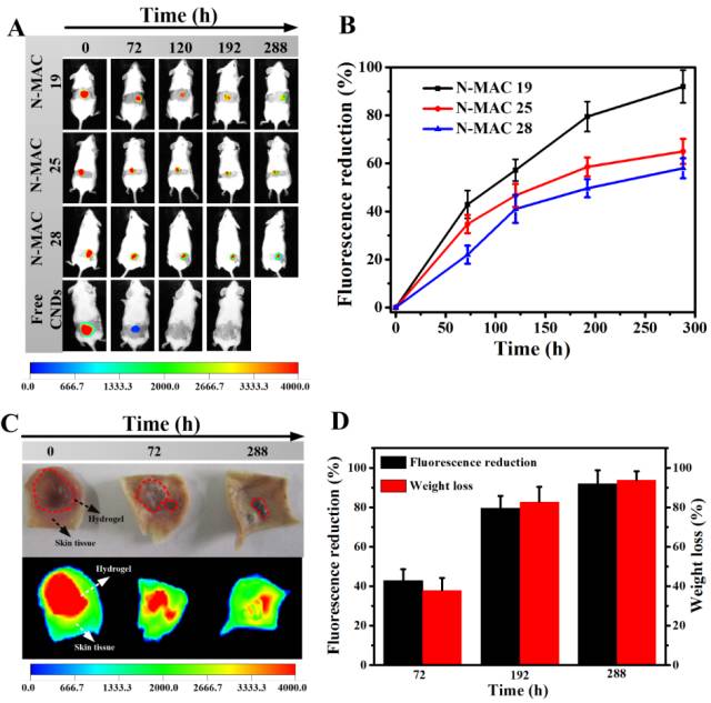 图3 纳米碳点作为荧光指示剂实现定量评价的水凝胶的体内降解行为
