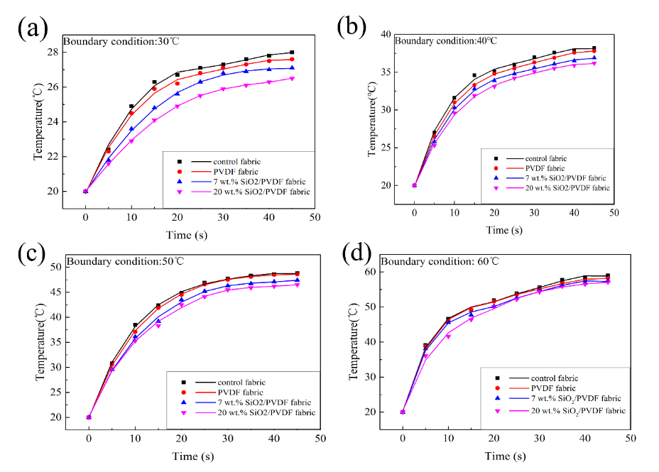 图3 不同测试条件下织物温升曲线图:(a)30 ℃;(b)40 ℃;(c)50 ℃;(d)60 ℃