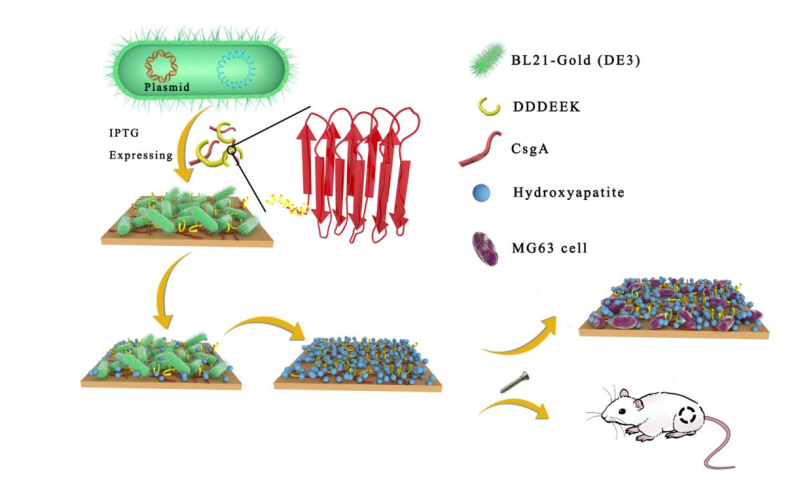 图1. CsgA-DDDEEK涂层材料的制备与诱导生物矿化层示意图。