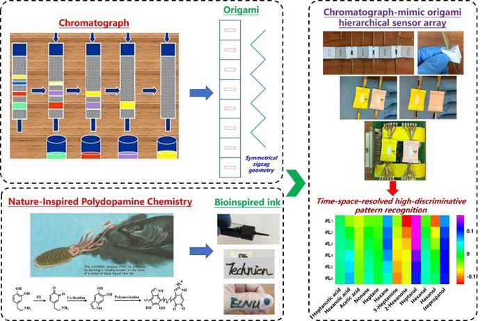 由于纸张以纤维素为主要材料,便宜易获取、柔软且具有疏松结构,可作为电子传感器件设计的优选载体。张闽副教授等人合成了一种“电子墨水”——聚多巴胺改性还原型氧化石墨烯构成的复合物,将其涂布在纸张上作为响应刺激的报告元素,以实现对不同类型刺激的电传导特性。受传统手工艺——折纸的启发,他们又进一步将纸张进行折叠设计,使之形成一种仿色谱结构用于负载聚多巴胺导电墨水,构筑折纸递阶型电子传感器件实现对复杂物理/化学刺激的差异化响应及模式识别分析。