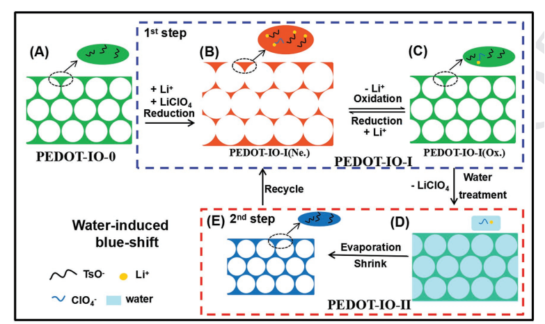 最近,中科院理化技术研究所仿生实验室江雷院士团队王京霞研究员与兰州大学郭金山教授合作在PEDOT光子晶体上实现了多彩图案的水写和电擦。他们通过电聚合制备聚3,4-乙烯二氧噻吩(PEDOT)光子晶体(PEDOT-IO-0)(图1),发现所制备PEDOT-IO具有四种状态和三种不同的开关形式(图2):第一个开关是从PEDOT-IO-0到PEDOT-IO-I(中性态)的不可逆的还原过程。第二个开关是PEDOT-IO-I(中性态)和PEDOT-IO-I(氧化态)之间的可逆电化学过程,伴随着由于离子掺杂/脱掺杂引起的可逆带隙(结构颜色)变化。第三个开关是水处理PEDOT-IO-I(氧化态)形成PEDOT-IO-II,由于水诱导LiClO4分子(Li+和ClO4-离子)的去除和周期性结构收缩,引起光晶带隙的蓝移(图3)。