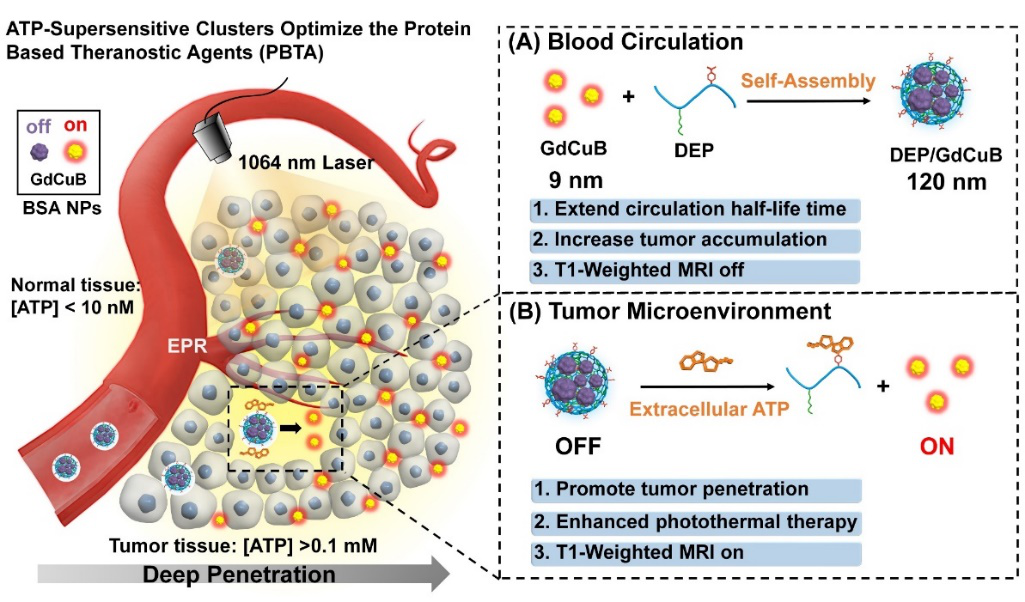 近期,中国药科大学药学院孙敏捷教授团队利用动态组装技术,开发出一种细胞外微环境ATP超敏蛋白团簇(DEP/GdCuB)成功攻克这一瓶颈,同时实现了蛋白粒子在肿瘤部位有效蓄积及深层渗透,并用于放大T1加权磁共振成像(MRI)引导的光热治疗(图1)。这一成果近日发表于Advanced Functional Materials杂志。