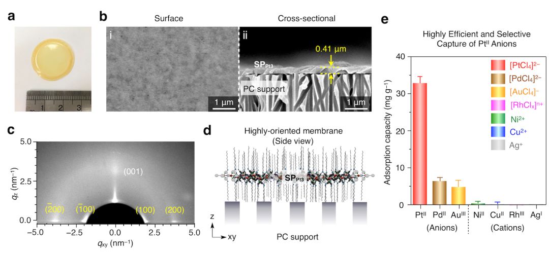 图2. 基于蜂窝状二维超分子聚合物的复合膜的照片(a),扫描电子显微镜图像(b), 二维掠入射X-射线衍射图像(c),结构示意图(d),以及对不同金属离子的吸附能力对比图(e)。