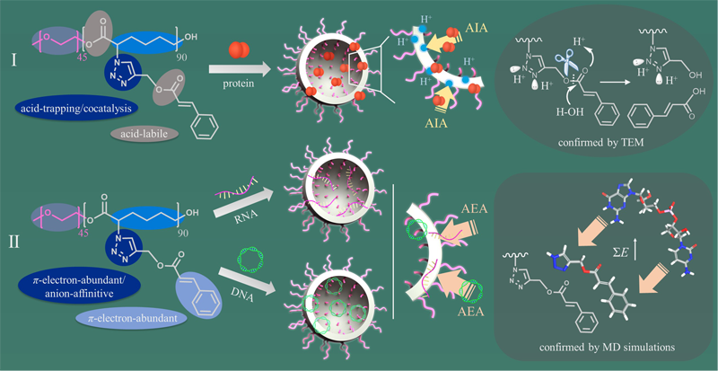 同济大学杜建忠教授提出了高效包载蛋白和核酸的高分子囊泡构建原理:“酸诱导吸附”(Acid-induced adsorption, AIA)和“亲和强化吸引”(Affinity-enhanced attraction, AEA)(图 1、图 2)。