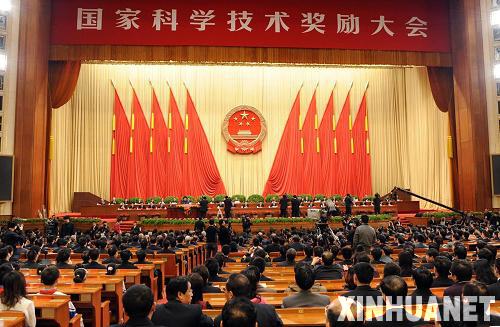 中共中央、国务院9日上午在北京隆重举行国家科学技术奖励大会。党和国家领导人胡锦涛、温家宝、李长春、习近平、李克强出席大会并为获奖代表颁奖。