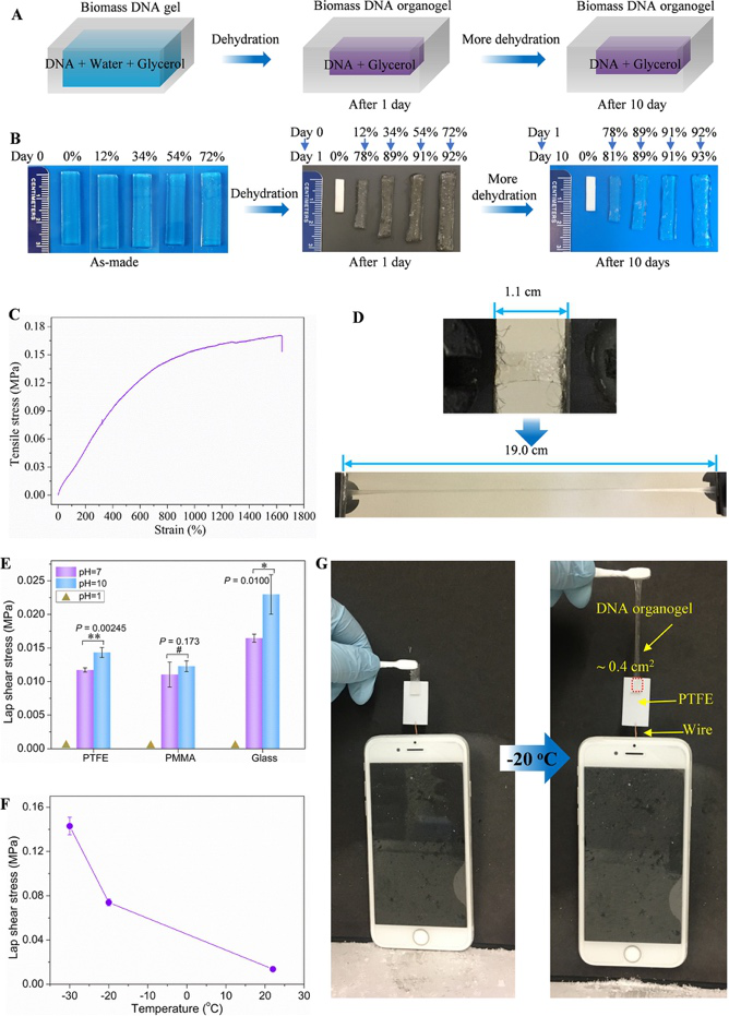 用甘油置换转化过程中的水,研究人员首次制备了基于DNA的有机凝胶。由于甘油极低的蒸气压、生物相容性和可抗冻特性,天然DNA有机凝胶具有非常高的机械强度的同时也保持了非常惊人的可拉伸性。研究人员意外地发现天然DNA有机凝胶可以很好地粘附在各种表面上。特别是可以粘附在用于不粘锅涂层的特富龙表面上。由于甘油的抗冻性,天然DNA有机凝胶可以不仅在零下三十度仍然保持柔软凝胶状态,而且粘附强度大大增强。利用这个特性,研究人员可以用仅有小拇指大小的天然DNA有机凝胶在零下二十度通过粘附提起一部手机。这个例子证明天然DNA展示了非常出色的有机凝胶形成能力,并且天然地具有特殊的粘附性能。也展示了其在特殊气候条件下,在柔性电子学和机器人领域的应用潜力。