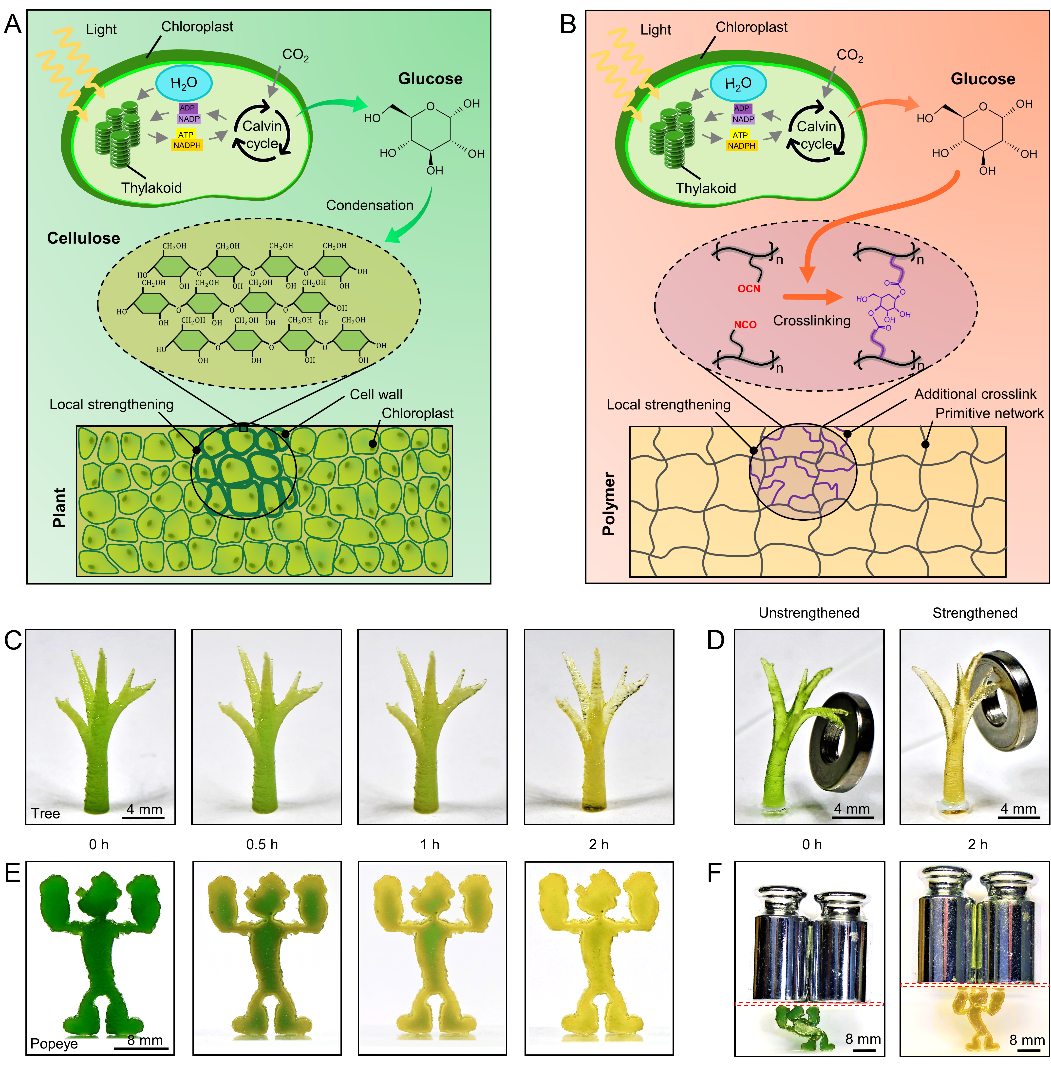 图1. 光合作用辅助重塑3D打印材料结构的概念。(A)光合作用帮助植物进行重塑。(B)光合作用帮助人造工程材料进行重塑。(CD)3D打印的树结构在光照下的增强过程。(EF)3D打印的大力水手结构在光照下的增强过程。