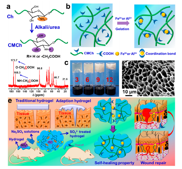 具有良好生物相容性、自修复性能和可选择性移除的注射型水凝胶作为伤口修复材料在实际应用过程中具有巨大优势。然而,同时满足这些条件的水凝胶伤口敷料的制备仍然面临着巨大的挑战。最近,武汉大学天然高分子团队周金平教授/陈云教授团队利用羧甲基壳聚糖的离子响应性,开发出了满足上述功效的水凝胶伤口敷料。该策略是通过引入三价金属离子Fe3+和Al3+与羧甲基壳聚糖(CMCh)上的羧基形成配位键,诱导溶液快速凝胶化(<10s)。由于配位键动态可逆的特点,该水凝胶表现出良好的自愈合能力、自适应性和温度响应性。进一步引入SO42- 与CMCh上的氨基发生交联反应,诱导水凝胶发生相分离,可以降低水凝胶的粘附性,使水凝胶在使用完后可以被无痛分离,且不产生残留。利用这些特性,这种水凝胶被用作伤口敷料,可以显著促进皮肤组织再生,提高伤口愈合速率。