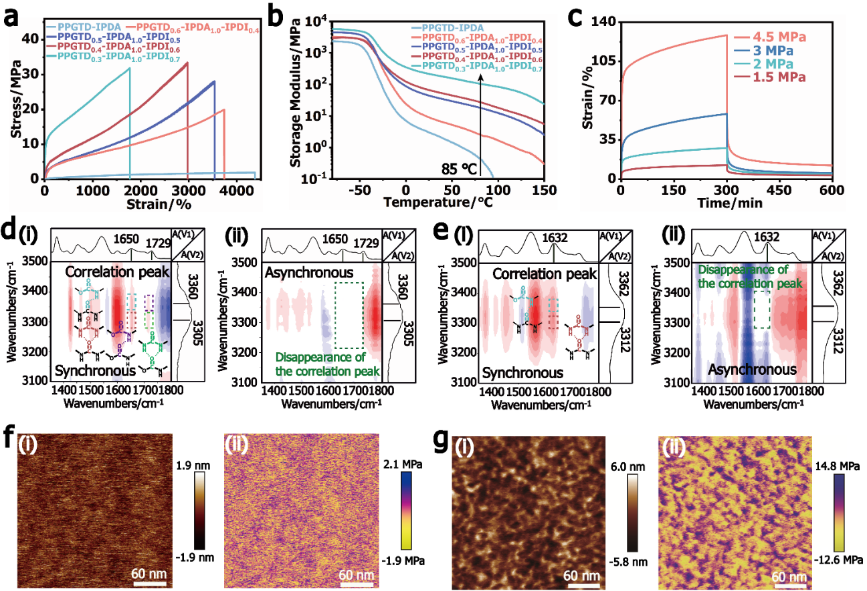 图2. PPGTDx-IPDA1.0-IPDI1-x弹性体材料应力应变曲线、温度-模量曲线和蠕变回复行为。PPGTD-IPDA与PPGTD0.4-IPDA1.0-IPDI0.6二维红外及AFM对比图。