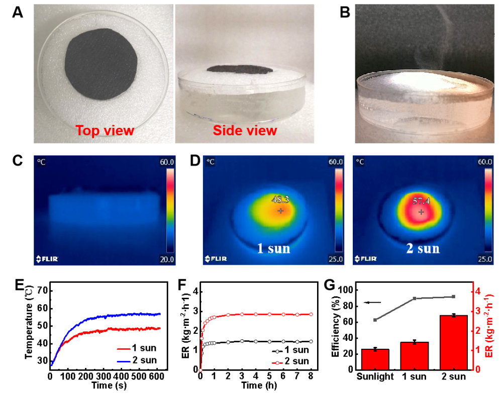 进一步地,作者论证了该非织造光热转化材料的定向导水特性及机制。如图3所示,液体在材料润湿梯度的作用下,通过其内部通孔以及亲水纤维导流渗透至另一面,同时当液体穿透到达亲水面时快速扩散,进一步加快了液体从疏水面到亲水面的渗透效果。而当亲水面朝上时,液体一旦接触到亲水面时,在亲水纤维的作用下扩散到整个表面,致使无法累积足够的高度克服疏水面的耐静水压,因而不会由亲水面到疏水面的穿透。在太阳能水蒸发应用中,作者将该定向导水非织造材料放置于液体上时,内部润湿梯度驱动下产生的差动毛细效应可以使得液体从疏水底面被抽吸至亲水表面,水分以一定速率源源不断地传输至光热转化表面,用于界面水蒸发。