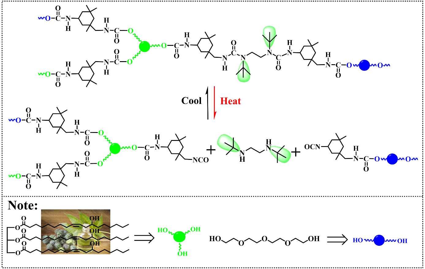 聚氨酯(PU)是一类重要的热固性材料,在国计民生中具有非常广泛的用途。鉴于目前绝大多数PU材料来自于不可再生、环境不友好的化石原料,以生物质制备PU材料受到了人们的广泛关注,这是因为生物质资源具有天然可再生、来源广泛、价格低廉以及生物可降解性等优点。作为一种重要的工业可再生原料,蓖麻油(CTO)是制备聚氨酯的理想原材料。这主要是因为:首先,蓖麻油分子中天然的羟基可直接与异氰酸酯进行反应形成PU材料,无需任何化学改性;其次,其长链脂肪酸结构可赋予所得材料优异的柔韧性、疏水性等。然而,该类植物油基聚合物通常具有稳定的交联网络,无法通过简单的加热方式来实现自修复、可回收加工等,因此造成了材料的浪费和环境的污染。解决该问题的一个有效方法就是引入动态共价键。与传统的热固性高分子材料相比,动态共价键高分子材料在具有较好的机械性能、热学性能、耐化学性能及尺寸稳定性基础上,还具有自修复、可回收、可塑等新功能。然而,目前报道的大多数植物油基动态共价键高分子材料机械性能较差,并且在修复或回收过程中通常需要较高的温度以及催化剂的作用(易导致材料的热稳定性变差)。