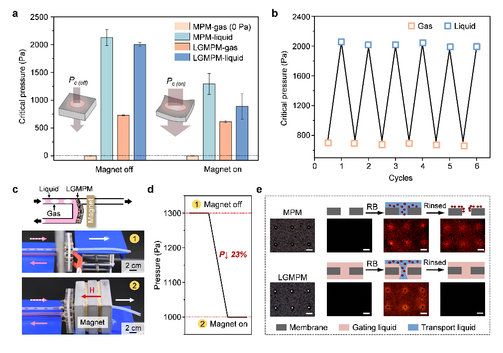 近期,厦门大学侯旭教授团队基于液体门控技术开发了一种新型的自驱动磁弹性液体门控膜系统,在外加磁场作用下发生弯月形的形变,实现了气体输运的可控开/关,并能够有效降低液体输送的门控压力阈值。利用磁场作为机械力,能够在无需额外环境压力驱动设备的条件下,对气体和液体的释放进行自驱动调节。