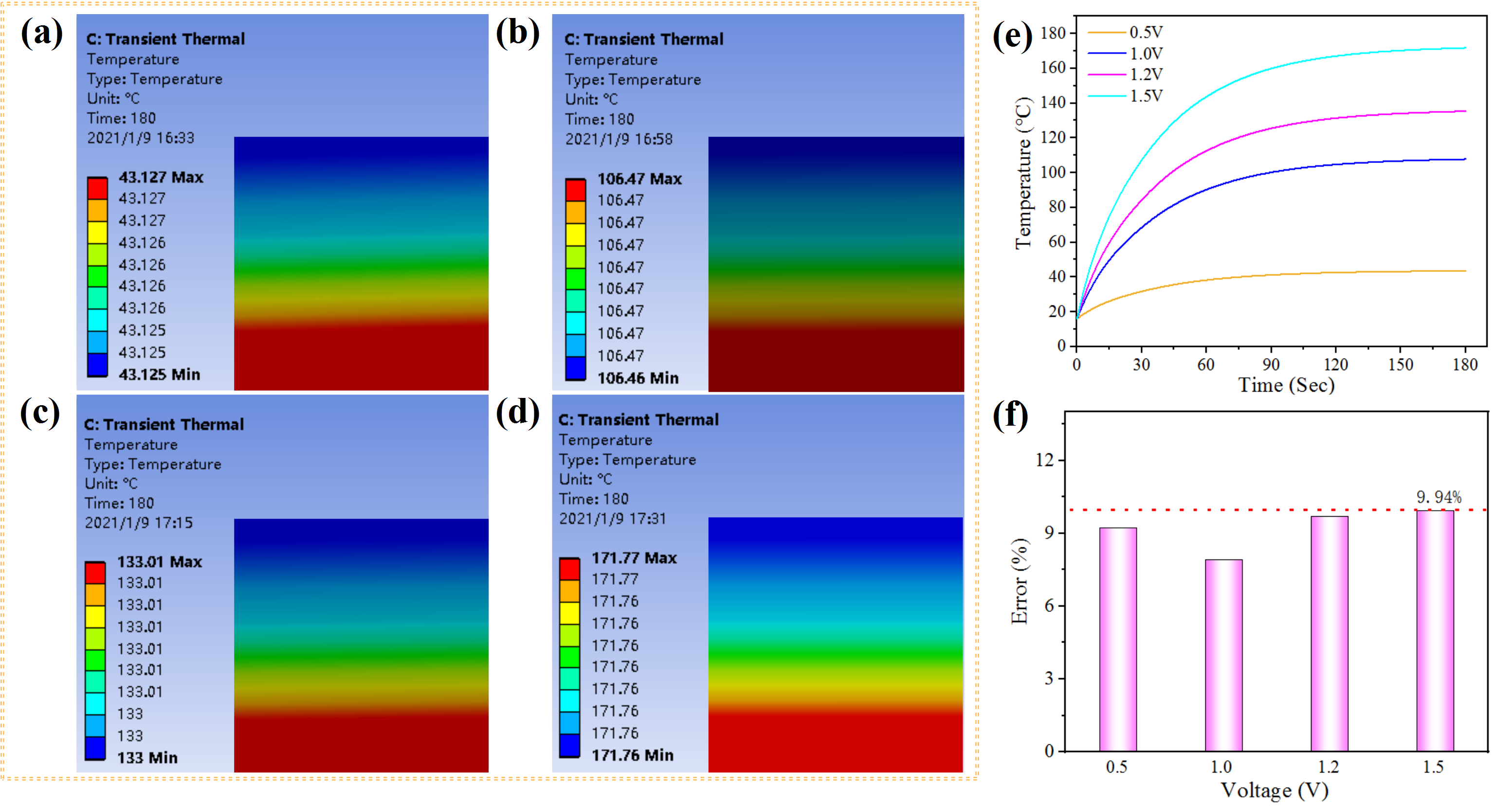 在 0.5 V、1.0 V、1.2 V 和 1.5 V 电压下获得的模拟饱和温度分别为43.1 °C、106.47 °C、133.01 °C 和 171.77 °C。图6 (e)可以看出,不同驱动电压下模拟加热温度变化趋势与实验升温过程一致。与实验数据相比,图6 (f)表明模拟结果与实际结果的偏差范围不超过10 %,就其原因在于电加热电极难以保持完美状态,而建模规则建立在理论基础上绝对完美条件下的方程。此外,加热器材料不完全均匀和保持稳定空气条件的复杂性也是造成偏差的原因。