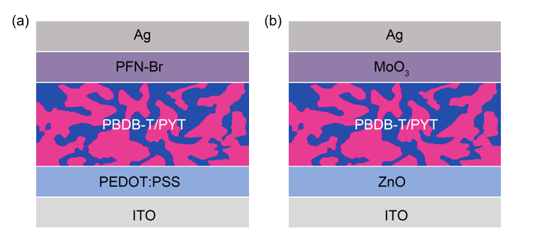 图1. 正置器件结构(a)和倒置器件结构(b)示意图。