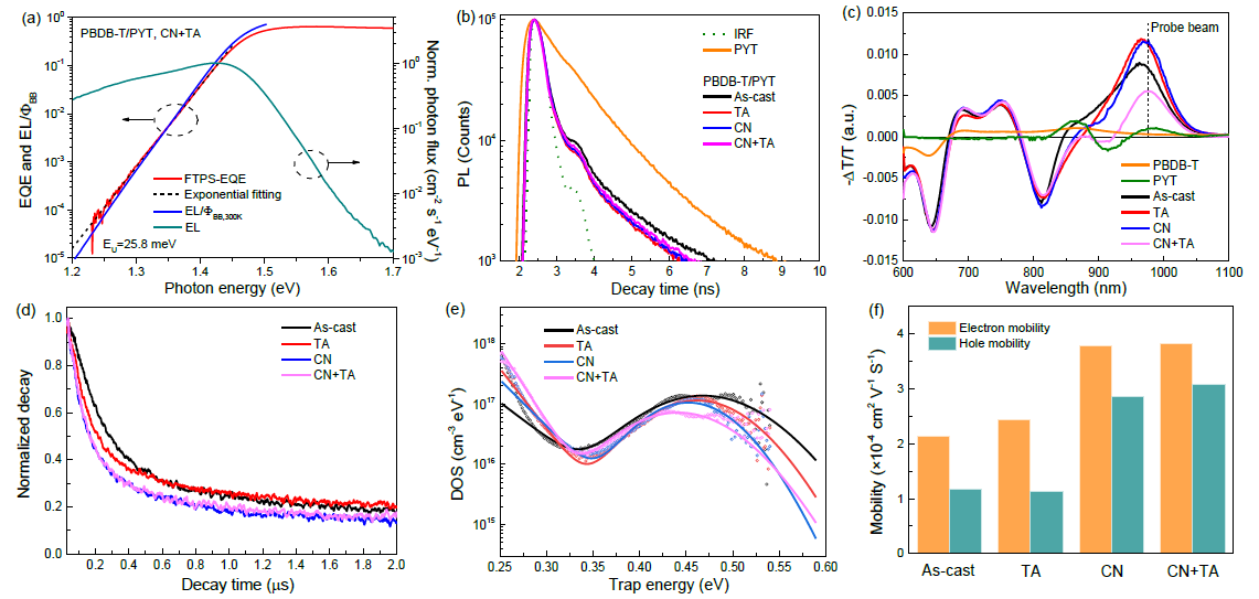图3. a) CN+TA处理后的PBDB-T/PYT的FTPS-EQE图。b) PYT薄膜及不同加工条件下PBDB-T/PYT薄膜的TRPL曲线。c) PBDB-T、PYT和不同加工条件下PBDB-T/PYT薄膜的PIA图。d) 不同加工条件下PBDB-T/PYT薄膜的TAS图谱。e) 不同加工条件下PBDB-T/PYT薄膜的DOS图。f) 不同加工条件下PBDB-T/PYT薄膜的电子和空穴迁移率统计图。