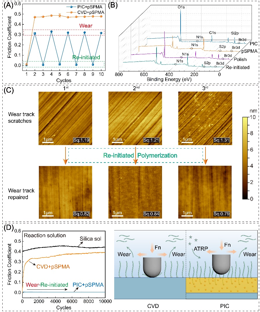 当接枝的聚合物刷磨损后,PIC仍然可以触发新的聚合反应(图3)。与传统的表面接枝聚合方法相比,该涂层的引发剂存在于整个无机层中,高机械强度的无机层可保护引发剂不易被磨损。在接枝聚合物刷时,聚合物刷不仅仅是存在于无机层表面,部分反应溶液可渗透进无机层从而实现在亚表面接枝聚合物刷,使得该涂层具有优异的机械稳定性。一旦表层的聚合物刷被磨损,由于底层引发剂的存在,该涂层可再引发接枝聚合物刷,该过程可重复多次。涂层在反应溶液中优异的润滑性能证实了聚合物刷可以实现在摩擦过程中的重复接枝。