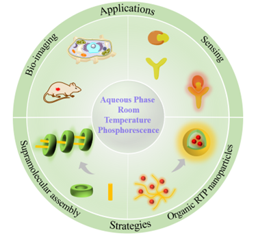作者总结了两种实现水相室温磷光的高效策略:磷光分子纳米粒子化以及大环超分子自组装。由于大多数有机分子在水溶液中很难溶解,其在水溶液中会自组装形成纳米粒子。对于磷光分子而言,重/杂原子的引入有效地促进了系间窜越,而其在水中形成纳米粒子后又可以提供刚性的微环境,抑制分子非辐射跃迁,从而实现水溶液中的室温磷光发射。此外,葫芦脲等具有刚性结构的大环主体分子在水溶液中可以与客体分子形成稳定有序的组装体,主客体分子之间的相互作用可以显著限制客体分子振动,抑制非辐射跃迁并且避免氧猝灭效应,从而实现高效的室温磷光发射。