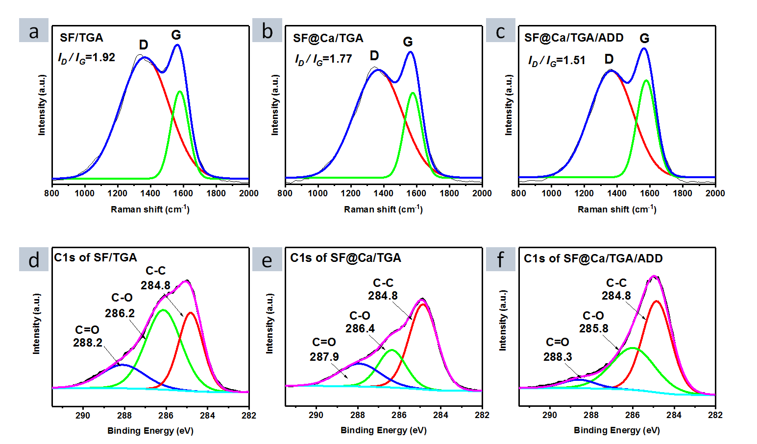 图7. SF@Ca/TGA/ADD 胶黏剂(a)TGA 和 DTG 曲线;(b)LOI 值;(c)HRR 和 THR 曲线