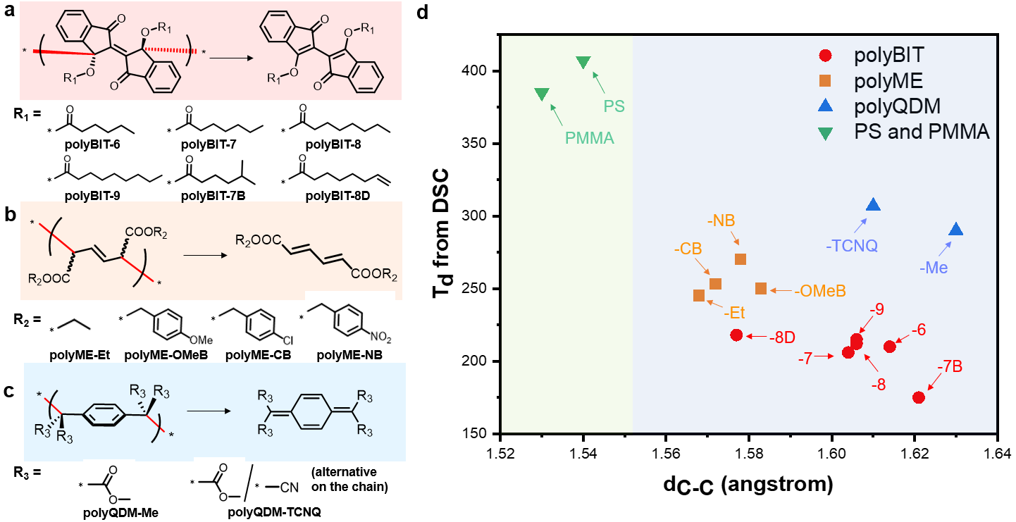 图2三种聚合物骨架下不同侧链的聚合物结构,以及它们的固态解聚温度Td和重复单元间C-C键长(dC-C)的关系。