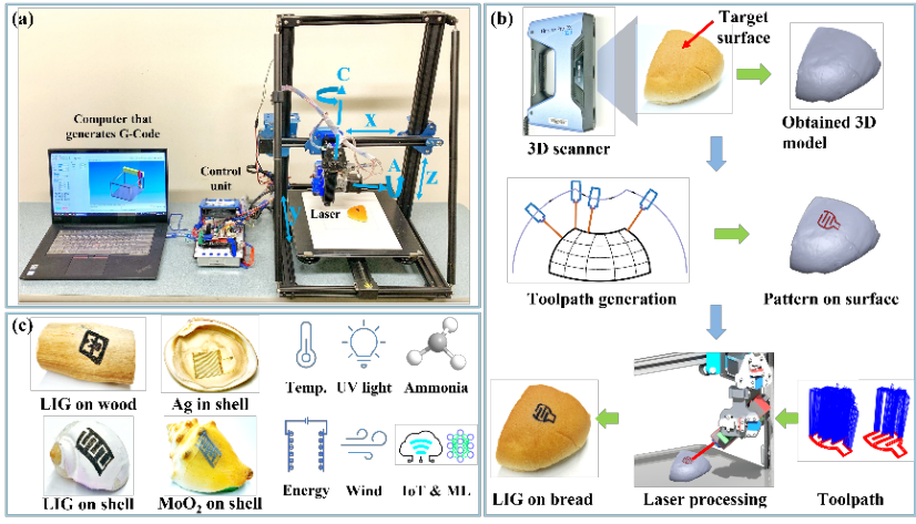 近年来,作为一种无掩模快速制造的激光直写技术(Direct Laser Writing,DLW)异军突起,用于制备包括激光诱导石墨烯、金属及其合金、金属氧化物/硫化物等材料,展示了在传感器、能源存储和转换领域巨大应用前景。但是该工艺在不规则表面上制备保形电子器件难以发挥最大的潜能。因为自然界中的物体如贝壳、石头和树枝等均有形状各异的曲面和不均一的粗糙度。利用现有工艺完成在任意复杂曲面上制备与基底完全贴合且获得高保真数据的三维电子器件具有很大的难度。这是由于三轴无法确保激光光束始终垂直于待加工任意三维表面,这极大限制了激光直写技术在三维曲面保形电子领域的应用。而完全贴合的曲面器件在可穿戴设备,机器人,人机互动,环境监测,物联网等领域都有重要的应用,因此,该工艺的研究及应用设计十分重要。