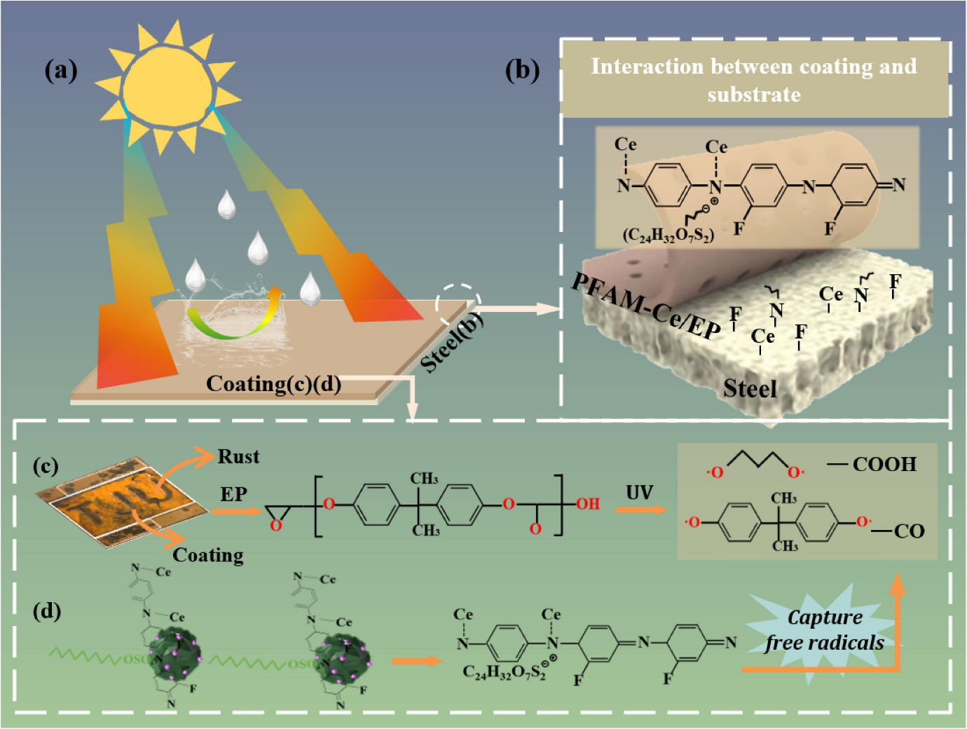 图8. (a) 在室外环境中模拟样品的示意图; (b) 碳钢表面的化学成分; (c) 紫外线暴露后EP涂层的化学变化; (d) PFAM-Ce复合材料的抗UV机制