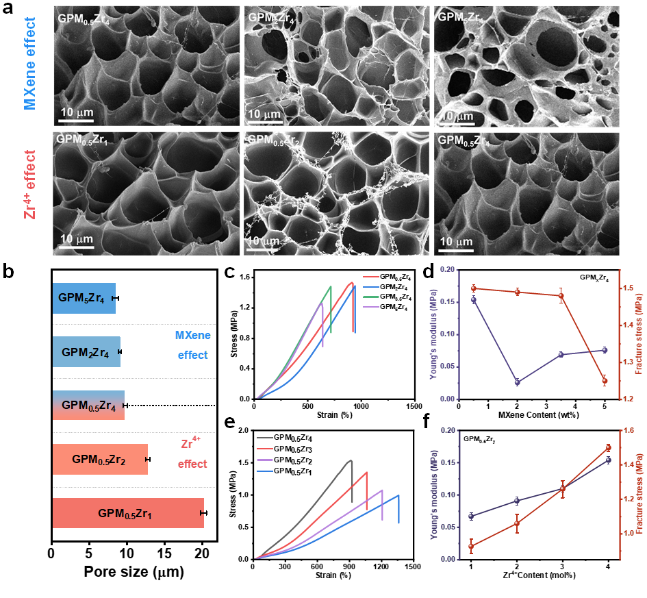 通过改变MXene和Zr4+的含量可以在宽范围内轻松调控水凝胶的内部孔结构以及力学性能。