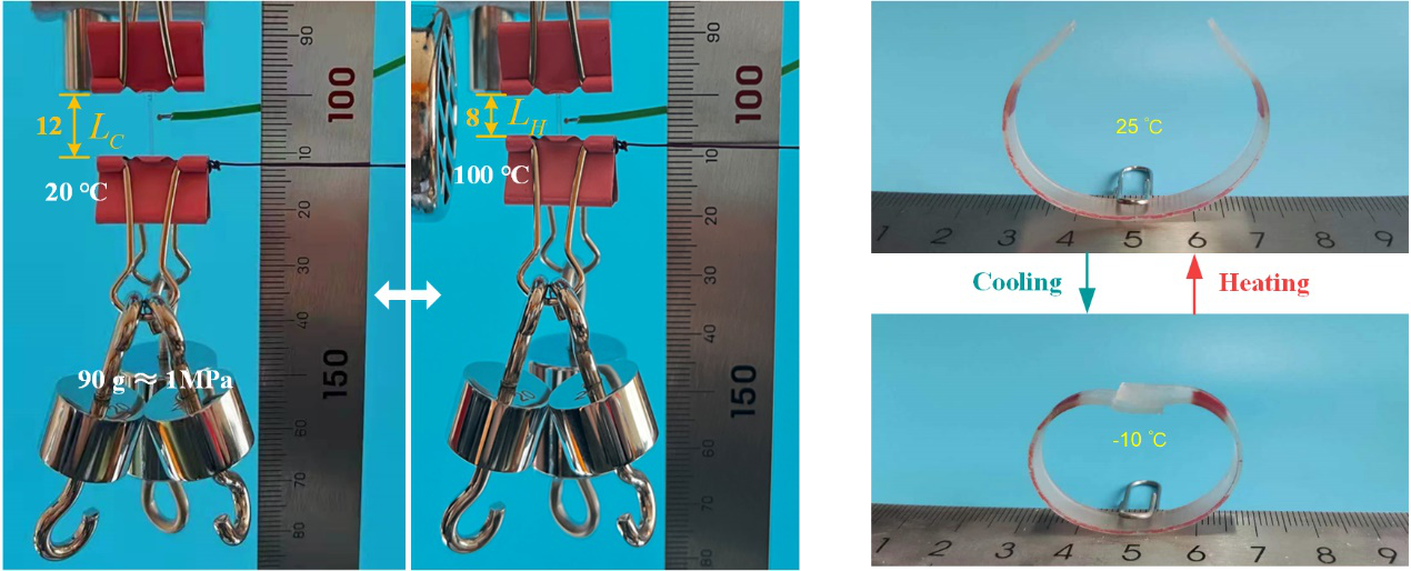 双向形状记忆高分子(2W-SMPs,two-way shape memory polymers)在热、电等外部刺激下可以实现不同形状间的可逆变换,在软体驱动、柔性传感等领域拥有广阔应用前景。现有2W-SMPs主要包括液晶弹性体和半结晶(高分子)网络。半结晶网络来源广泛、制备简单、成本低、性能易调控,非常具有商业化潜力,因此在近10年内受到国内外学者的广泛关注与研究。半结晶网络的双向形状记忆效应主要来源于其在取向状态下可能发生的结晶引发的伸长(CIE,crystallization-induced elongation)和熔融引发的收缩(MIC,melting-induced contraction)。施加恒定拉伸应力是使半结晶网络产生取向、发生CIE/MIC,从而获得双向形状记忆/驱动功能最为简单而有效的策略。而要实现无外力双向形状记忆效应,需要将外力“替换”为内力,利用内力保持网络取向并使网络发生CIE/MIC。因此,无论恒外力还是无外力双向形状记忆效应,其关键在于CIE/MIC。然而,有关CIE/MIC的热力学及分子机理未被揭示,半结晶网络的双向形状记忆/驱动机理亦不清晰,这严重制约了高性能半结晶2W-SMPs的设计及研发。