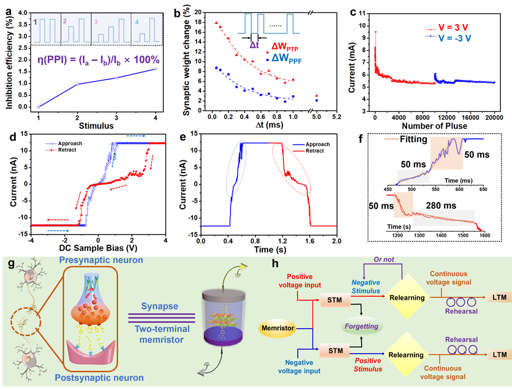 在扫描电压模式下,基于HOFs@Au的忆阻器可以很容易地实现渐进式电导调谐,这可以用来模仿生物神经元中的突触行为。通过重复电压刺激,建立了一个遗忘-再学习-遗忘的记忆过程。具体来说,通在初始阶段经历快速的损失,随后经历缓慢的衰减,遵循艾宾浩斯遗忘曲线。基于HOFs@Au的忆阻器与人类记忆遗忘的趋势吻合较好,可以模仿人试图随着时间的推移的遗忘过程。逆电压刺激一段时间后(10次,约160 s),器件电流可以再次恢复到较高水平,表现为“再学习”过程(图3)。然而,并不是所有被遗忘的内容都能被重新学习,尤其是在正电压刺激的区域,这表明长时间记忆能力受损。此外,通过控制HOFs@Au忆阻器器件中的限制电流(ICC),同样也可以实现电阻状态的精准调控,这为突触强度的电导状态提供了额外的策略。