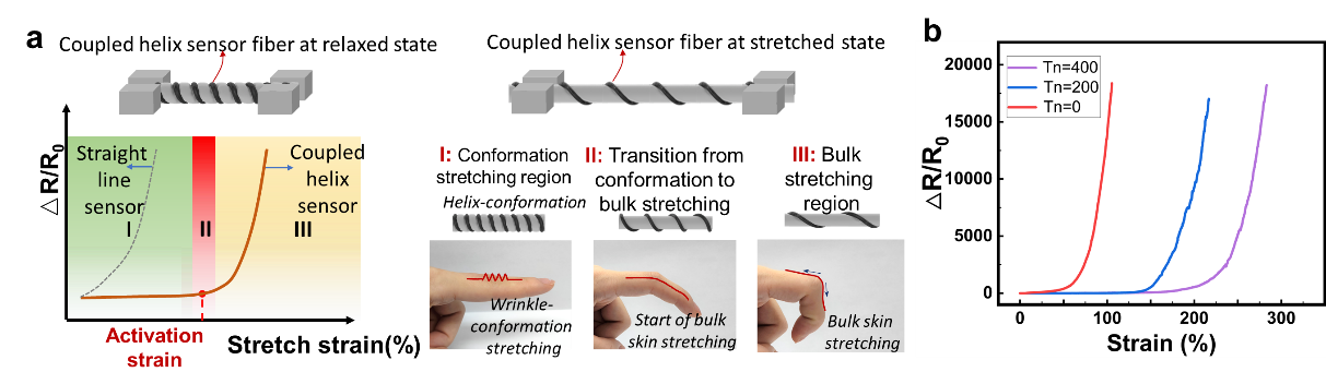 丝线缠绕是一种非常古老的材料加工策略,即便是科技发达的今天,我们依然喜欢借助这一简单方式将不可拉伸或者非弹性功能材料甚至器件缠绕到弹性体芯材上,从而获得本体不可拉伸材料的高度可拉伸或弹性特性。然而,时至今日,这一古老智慧背后的科学认识仍旧模糊。众所周知,高分子材料的机械性能从根本上依赖其化学结构与分子链的构象行为。这在聚合物链分子构象水平上已经得到充分认识,但在宏观材料水平上,构象的意义和价值还远未得到充分的认识。例如,螺旋结构材料的柔韧性、可拉伸性或者弹性通常被理解为变形,而非构象变化行为;但DNA分子双螺旋结构的变形行为却被习惯性地理解为分子链构象变化行为。这种对微观构象和宏观变形行为的习惯性分离思考,使得我们无法建立它们之间可能存在的共性联系。