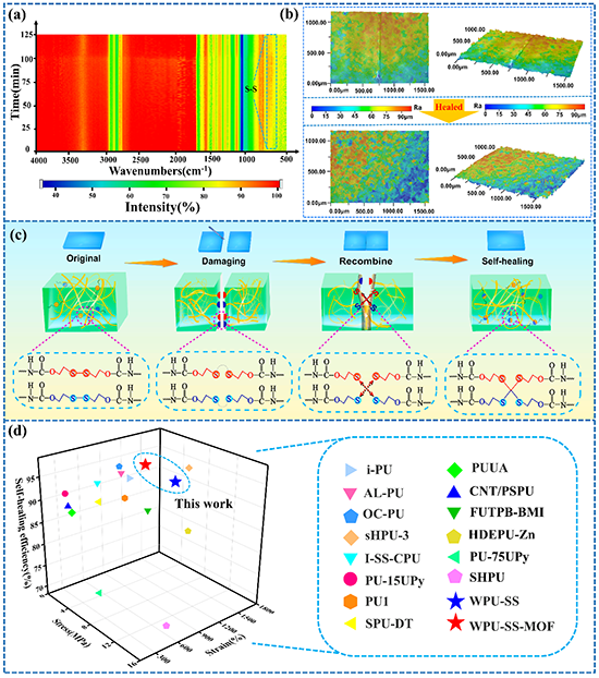 WPU-SS-MOF复合膜的自修复机理完全依赖于基材的S-S动态交换反应,MOF不具备任何自修复特性。由变温红外(ATR)和光学轮廓图像分析结果表明,S-S的链交换反应是一个动态的过程,且随着温度升高和降低S-S的重组反应活性会随之增强和减弱。同时,在热驱动的情况下S-S在体系中始终存在,且S-S在被破坏后不断的发生动态重组反应,促使断面逐渐由内致外实现完全自修复。