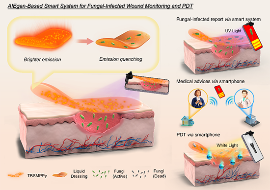 图1. 基于AIEgen的真菌感染伤口监测和按需光动力治疗智能系统的工作原理图