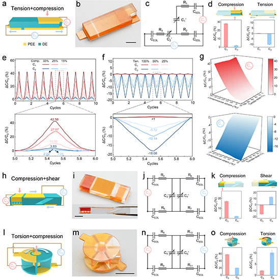 图5 组合式离电传感器 (a) 拉压组合传感器示意图 (b) 器件实物图 (c) 拉压组合传感器等效电路图 (d) 单一传感模式下的器件信号 (e) 压缩激励下的电容-圈数变化曲线 (f) 拉伸激励下的电容-圈数变化曲线 (g) 拉压组合变形下的信号谱 (h) 压剪组合传感器示意图 (i) 器件实物图 (j) 压剪组合传感器等效电路图 (k) 单一传感模式下的器件信号 (l) 压扭组合传感器示意图 (m) 器件实物图 (n) 压扭组合传感器等效电路图 (o) 单一传感模式下的器件信号