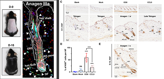图2. 研究者观察到OG6可促进小鼠毛发生长并表征其刺激毛囊进入生长期的生物学过程。
