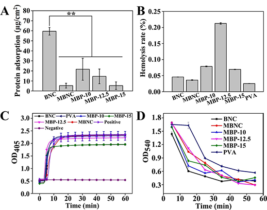 图5 BNC、MBNC和MBP管的血液相容性:(A)蛋白吸附量;(B)溶血率;(C)血浆复钙动力曲线;(D)全血凝固时间。(PVA膜作为对照)**代表p<0.01