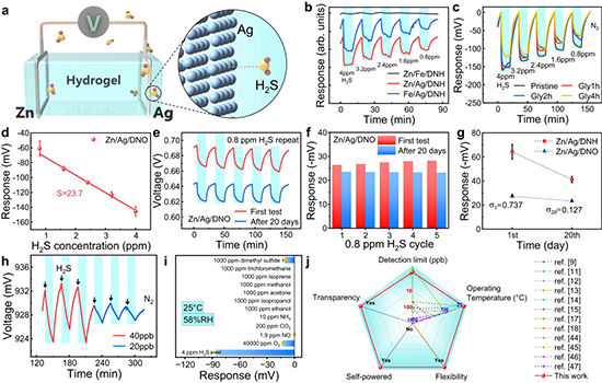 生物标志物作为一种可以客观测定和评价生物体内生化和生理状态的指标,其准确和稳定的检测可以用于疾病早期诊断、预防以及治疗过程中的监控,在医疗健康领域发挥着重要作用。人体呼出气体中含有大量化合物,与不同器官的代谢密切相关,是理想的用于非侵入性疾病诊断的体外生物标志物。例如,口臭患者呼出气体中的H2S就明显高于正常人,而且肉类的腐败也会产生H2S,对H2S的检测具有重要的实际应用前景。一般,化学成分分析仪可以对呼出气体中的生物标志物进行精准的测量,但其操作繁琐、成本高、耗时长,无法实现实时的检测,因此迫切需要开发高性价比的便携式传感器件。迄今,化学电阻和电化学式的气体传感器已被广泛报道,但大都难以实现可穿戴的要求。例如,化学电阻式气体传感器在室温或零度以下的温度下传感性能极差,因为化学物质对传感材料表面的微弱作用很难引起整个装置的电信号发生较大变化。而电化学传感器面临着液态电解质泄漏和挥发以及电极的腐蚀等问题。为了进一步适应在可穿戴领域中的应用,对传感器件提出了更多的要求,包括高传感性能、机械灵活性、室温操作、环境耐受性以及自供电能力等,研究者亟需进一步优化现有传感器件或提出新型的器件结构和原理来取得突破性进展。