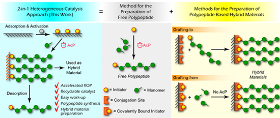 人工合成的聚多肽由于具有良好的生物可降解性和性质可调性,备受生物医药领域和材料工程领域的研究者们的关注。近二十年以来,随着氨基酸环内酸酐(NCA)开环聚合制备聚多肽的技术不断革新,聚多肽材料逐渐在抗菌、药物/基因递送和组织工程等领域被广泛研究和应用。然而,由于NCA聚合过程往往存在引发效率低、聚合速率缓慢、对环境敏感以及分子量难控制等问题,导致其获得的聚多肽在材料领域的应用受到极大的限制,而将聚多肽与其他材料进行复合应用的研究更是鲜有报道。