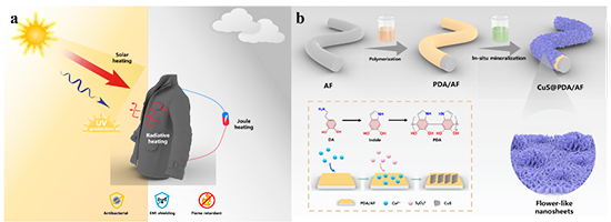 近日,四川大学高分子研究所吴宏教授和郭少云教授团队提出了一种制备多功能智能纺织品的新策略,在前期超疏水光热涂层的研究基础上(ACS Appl. Mater. Interfaces 2023, 15 (2): 3522-3533),启发于生物矿化过程,通过在芳纶(AF织物上原位沉积聚多巴胺(PDA涂层,以PDA作为中间层鳌合铜离子提供生长位点,原位生长并锚定硫化铜(CuS纳米阵列,进而制备得到CuS@PDA多功能光热涂层纺织品。该纺织品具有93.7%的高太阳光吸收率和4630 S×m-1的高导电率,表现出优异的太阳光和焦耳加热性能,即使在低能量输入的情况下也能够有效地为人体供暖同时,该纺织品的红外线(IR)发射率降低,减少了热辐射损失,有助于保持体温恒定,而且集成了出色的电磁屏蔽(59 dB)、近乎完全的紫外线防护(UPF=2567)以及理想的阻燃和抗菌性能。此外,该纺织品机械稳定性良好,可确保涂层织物在复杂环境下长期高效地使用。