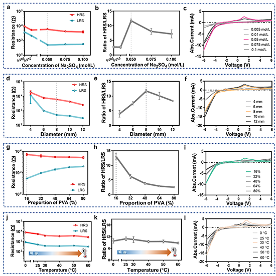 为全面表征全柔性存储单元的电学性能,研究小组测试了柔性存储器件在氧化过程中的频率响应特性,绘制了电化学阻抗谱。根据奈奎斯特图以及液态金属氧化的原理,通过搭建等效电路的方式来评估柔性存储器件内部的电化学系统及其性质。借助等效电路模型的分析,可更深入地了解柔性存储器件内部电化学系统的运行机制,为进一步优化器件性能提供指导。(图3 j、k、l)