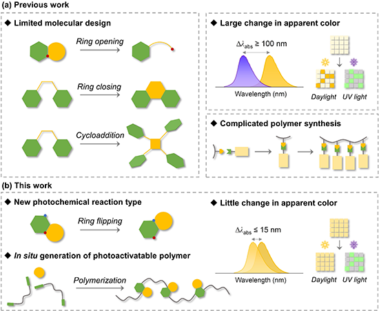 光激活发光是指能够通过光照可控地激活并增强发光的现象,包括荧光、磷光和自由基发光。近年来,光激活发光材料在光电材料、信息存储和生物成像方面都显示出了巨大潜力。通过光化学反应,将不发光、弱发光的分子快速转变为明亮的发光分子是设计光激活发光材料的有力手段。目前广泛报道的光化学反应可以分为开环反应、成环反应和[2+2]环加成反应,其分子设计主要局限于几种典型的结构单元如螺吡喃、二芳基乙烯等。并且,这些反应通常导致分子的共轭结构发生了较大变化,会同时引起其吸收光谱和表观颜色的明显变化,使其在信息加密、防伪等领域的应用受到限制。此外,与小分子体系相比,基于聚合物的发光材料具有优异的成膜能力、良好的可加工性和均匀的发光性能。然而,由于目前光激活结构单元的种类有限,将其引入聚合物链中通常需要复杂而耗时的单体合成,大大限制了其大规模生产和实际应用。因此,探索反应前后具有相似共轭结构、易于制备聚合物材料的新型光激活单元仍然具有挑战性。