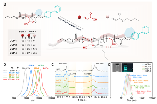 具体而言,运用可逆加成-断裂链转移(RAFT)聚合作实现分散聚合,设计并合成了一系列由两相纳米结构组成的不同嵌段比例的室温磷光高分子(GCPs)(图2)。