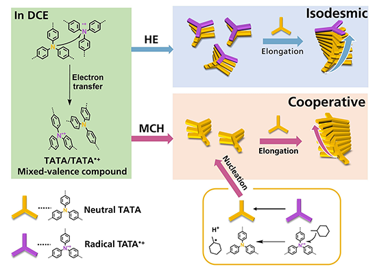 该工作首次从自由基的角度解释了超分子组装过程中的路径复杂和螺旋反转现象,在双溶剂体系中对基于三芳胺的超分子组装路径进行了详细的探究,为理解和预测三芳胺衍生物超分子组装的路径复杂度提供一种新的方法和角度,使超分子组装路径的精确控制成为可能,并为手性功能材料的设计和调控开辟新的道路。