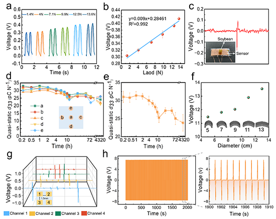 柔性压力传感器的性能表征。a)传感器在不同负载下的电压输出。b)传感器在不同负载下的压力和电压之间的关系。c)柔性压力传感器的最小检测限。d)传感器不同位置的压电系数。e)不同时间传感器压电系数的平均值。f)在不同曲率的拱形结构的作用下,柔性压力传感器的输出发生变化。g)柔性压力传感器抵抗串行干扰的能力。h)柔性压力传感器在4000次作用下电压输出的变化。数据以平均值±SEM表示。