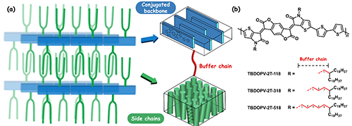 该工作提出缓冲链模型来描述共轭主链和侧链之间的组成结构,为理解共轭高分子主链与侧链的相互作用、结晶行为以及电子学性能提供一个简单易理解的结构模型,可用于指导开发高性能的半导体和导电高分子材料。