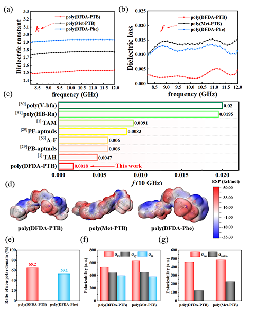 图4. (a) 三种聚苯并噁嗪高频介电常数 (8.2~12 GHz) 的实部;(b) 三种聚苯并噁嗪高频介电损耗 (8.2~12 GHz);(c) poly (DFDA-PTB) 介电损耗与其他文献的对比图;(d) 三种聚苯并噁嗪介电性能的DFT模拟示意图;(e) poly (DFDA-PTB)和poly (DFDA-Phe的非极性结构域比值;(f) poly (DFDA-PTB)和poly(Met-PTB) 在xx、yy和zz方向上的极化率张量分量。(g) poly (DFDA-PTB)和poly(Met-PTB)的各向同性极化率 αiso和各向异性极化率 αaniso。