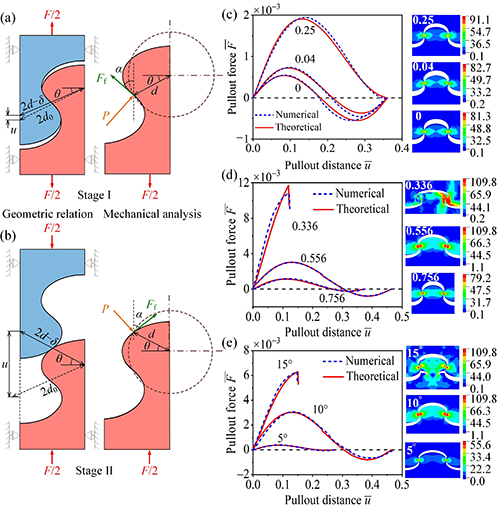 图2 椭圆型骨缝拉拔过程的力学理论分析。(a)阶段I。(b)阶段II。(c)—(e)分别为考虑不同摩擦系数、纵横比和联锁角时的力—位移关系和von Mises应力分布。